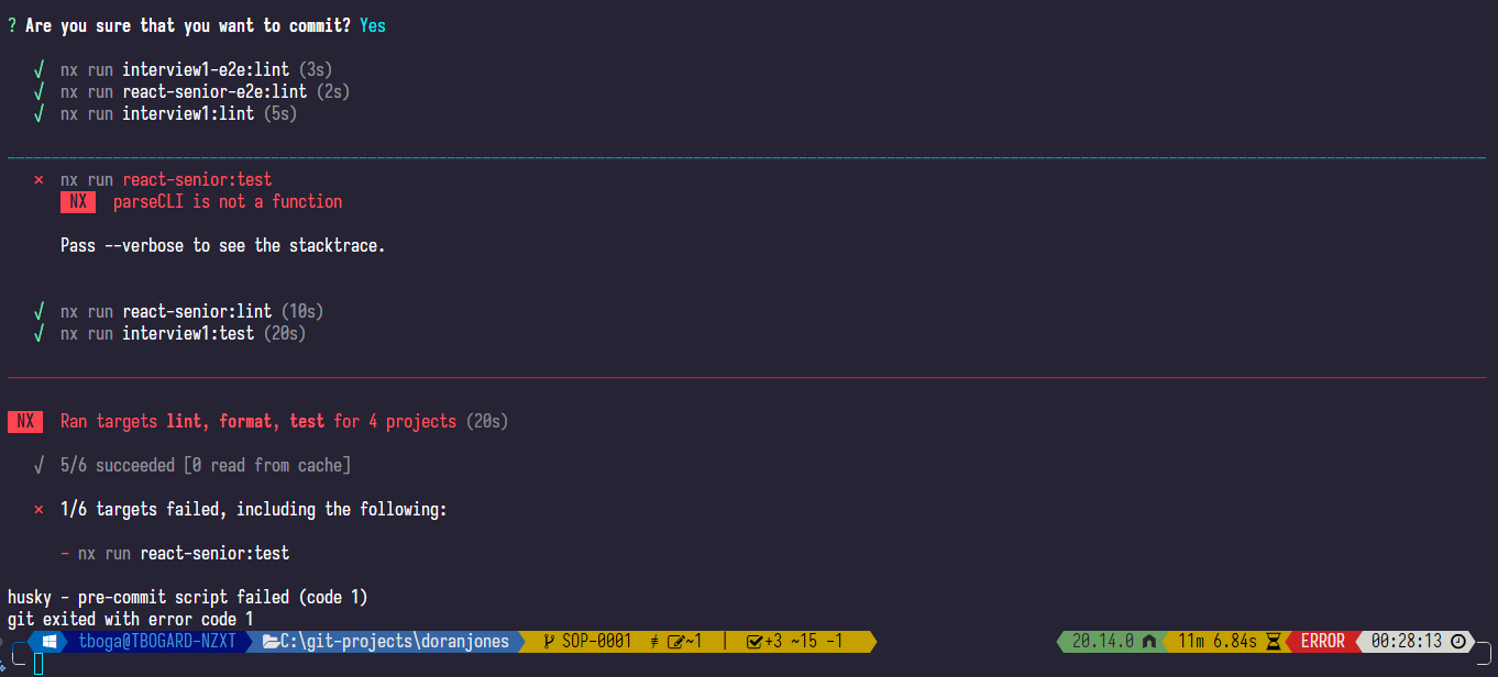 If you decide to commit, from here every affected project will run the required targets (lint, format and test). From here, if something fails, you might need to fix it