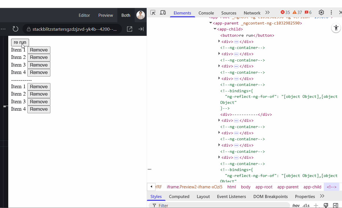 It's also important that the candidate has an understanding why the untracked function is needed when we want to remove dependency tracking in an effect. Problems I personally encountered many times were that an effect was reading multiple signals, but also modifying some, therefore it created an infinite cycle and was running all the time. Personally, I use untracked most of the time, leaving only the dependency signals outside of it. In the following example I want to focus on the input element when the button is clicked. I use afterRenderEffect which works similarly as effect, with the key difference being that it runs after the application has completed rendering.